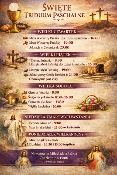 W DNI POWSZEDNIE: Godz.: 7.00, 8.00, 15.00 - Msza św. z Koronką do Miłosierdzia Bożego (opócz soboty) i 19.00 (Spowiedź na 30 minut przed Mszami o godz. 7.00, 8.00 i 15.00 i podczas Mszy świętej o godz. 19.00)